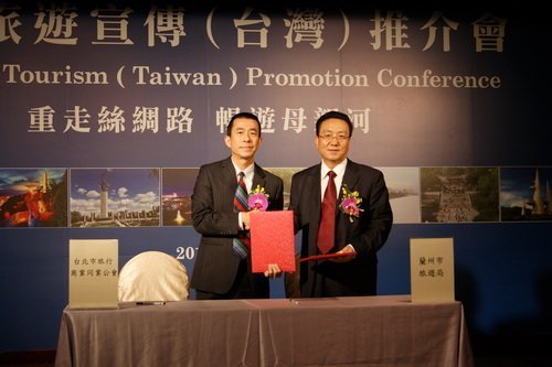 圖/台北旅行商業同業公會理事長吳志健及蘭州市旅遊局長陶明貴進行簽約儀式。