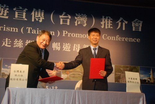 圖/東方旅行社副董事長杜明錡與甘肅康暉國際旅行社副總經理鄭偉進行簽約儀式。