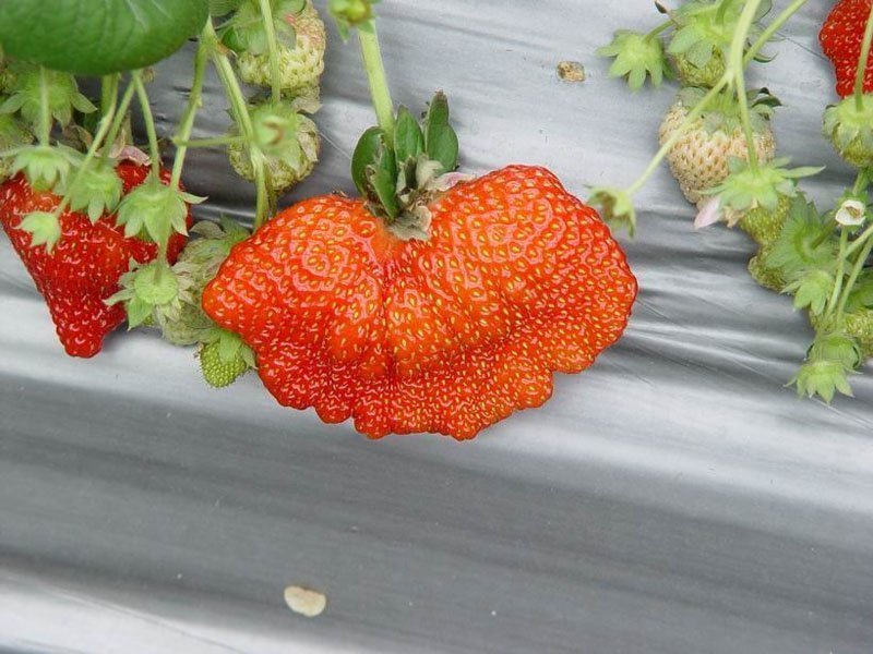 現在適值草莓的二期果,這一批果實較容易結出扇形果,形狀像似兩個連在一起的雙胞胎草莓,或是多個連在一起狀似手掌的草莓,雖然外形奇怪,不過卻不影響其甜美的滋味。