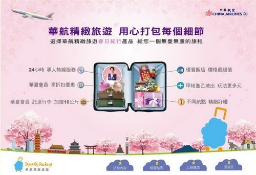 現正促銷的「詠‧秋冬」系列產品即將進入尾聲,為迎接明年新春的到來,華航精緻旅遊推出2016年第一季促銷活動–「春日紀行」!即日起,購買華航春日紀行系列產品,華夏會員可享會員折扣優惠,長程線每人優惠新台幣1,000元;區域線每人優惠新台幣500元,行程出發日於2016年1月21日起,至2016年5月10日(含)前主行程與續住須使用完畢。