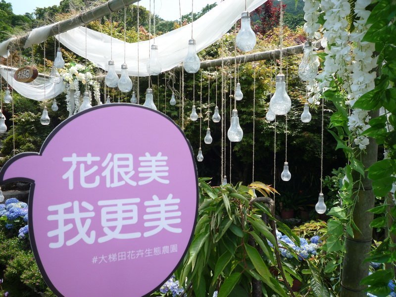 農園內特別規劃Instagram拍照打卡點,美麗的繡球花搭配燈泡點綴在旁,吸引許多情侶、好友、家族前來拍照,一旁更是擺放許多手板道具提供民眾拍照,許多日、韓、大陸的美女都等不及與美麗繡球花造景合影上傳照片。