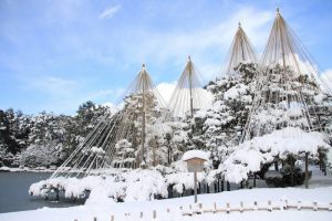 日本三大名園之一的金澤「兼六園」, 由於兼具「宏大」「深邃」「人力」「蒼古」「水泉」「眺望」六種庭園景觀意境而得名。迴游式庭園的四季景色各有丰采,而冬季的「吊松」更添庭園看頭。吊松也稱雪吊,據說始於江戶時代初期,是人們為避免厚重積雪壓斷名貴樹木所採用的保護措施。兼六園內的唐崎松是園中姿態最為優美的黑松,近兩百年的樹齡儼然是重要文化資產,每年11月1日施加的吊松作業,光是支撐唐崎松的繩子就使用800多條,施行作業的過程成為日本媒體年年報導的要點,也逐漸被視為一項傳統儀式,有了宣告進入冬季時序的深層意涵。